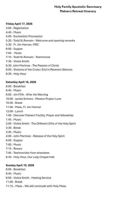 [{"title":"Friend-Raiser Dinner – April","start":"2026-04-16T17:30:00+00:00","end":"2026-04-16T20:30:00+00:00","url":"https:\/\/www.malvernretreat.com\/events\/friend-raiser-dinner-april\/","id":20353,"className":"men"},{"title":"Holy Family Apostolic Sanctuary – 2026","start":"2026-04-17T15:00:00+00:00","end":"2026-04-19T12:00:00+00:00","url":"https:\/\/www.malvernretreat.com\/events\/holy-family-apostolic-sanctuary-2026\/","id":20394,"className":"women"},{"title":"Catholic in Recovery","start":"2026-04-17T17:00:00+00:00","end":"2026-04-19T12:00:00+00:00","url":"https:\/\/www.malvernretreat.com\/events\/catholic-in-recovery\/","id":20498,"className":null},{"title":"5 Day Silent Retreat – Spring 2026","start":"2026-04-19T18:00:00+00:00","end":"2026-04-24T11:00:00+00:00","url":"https:\/\/www.malvernretreat.com\/events\/5-day-silent-retreat-spring-2026\/","id":20329,"className":"women"},{"title":"Matt Talbot #57 – 2026","start":"2026-04-24T16:00:00+00:00","end":"2026-04-26T12:00:00+00:00","url":"https:\/\/www.malvernretreat.com\/events\/matt-talbot-57-2026\/","id":19912,"className":"addiction"},{"title":"St. Joseph The Worker Awards Dinner 2026","start":"2026-04-30T17:30:00+00:00","end":"2026-04-30T20:00:00+00:00","url":"https:\/\/www.malvernretreat.com\/events\/st-joseph-the-worker-dinner-2026\/","id":20455,"className":null},{"title":"St. Joseph The Worker Group – 2026","start":"2026-05-01T16:00:00+00:00","end":"2026-05-03T12:00:00+00:00","url":"https:\/\/www.malvernretreat.com\/events\/st-joseph-the-worker-group-2026\/","id":20004,"className":"men"},{"title":"Most Blessed Sacrament – 2026","start":"2026-05-01T16:00:00+00:00","end":"2026-05-03T12:00:00+00:00","url":"https:\/\/www.malvernretreat.com\/events\/most-blessed-sacrament-2026\/","id":20005,"className":"men"},{"title":"Matt Talbot MC #5 for Couples – 2026","start":"2026-05-01T16:00:00+00:00","end":"2026-05-03T00:00:00+00:00","url":"https:\/\/www.malvernretreat.com\/events\/matt-talbot-5-2026\/","id":20305,"className":"addiction"},{"title":"Young Adult Retreat – May 2026","start":"2026-05-01T16:30:00+00:00","end":"2026-05-03T11:00:00+00:00","url":"https:\/\/www.malvernretreat.com\/events\/young-adult-retreat-may-2026\/","id":20543,"className":"young"},{"title":"League Of Sacred Heart – 2026","start":"2026-05-05T16:00:00+00:00","end":"2026-05-07T12:00:00+00:00","url":"https:\/\/www.malvernretreat.com\/events\/league-of-sacred-heart-2026\/","id":19950,"className":"women"},{"title":"Mothers of Children W\/ Disabilities","start":"2026-05-06T08:30:00+00:00","end":"2026-05-06T14:00:00+00:00","url":"https:\/\/www.malvernretreat.com\/events\/mothers-of-children-w-disabilities\/","id":20535,"className":"women"},{"title":"Matt Talbot #48 – Spring 2026","start":"2026-05-08T17:00:00+00:00","end":"2026-05-10T12:00:00+00:00","url":"https:\/\/www.malvernretreat.com\/events\/matt-talbot-48-spring-2026\/","id":20534,"className":"men"},{"title":"Mid-May Arch. Fitzmaurice – 2026","start":"2026-05-15T17:00:00+00:00","end":"2026-05-17T12:00:00+00:00","url":"https:\/\/www.malvernretreat.com\/events\/mid-may-arch-fitzmaurice-2026\/","id":20006,"className":"men"},{"title":"Loving God with Heart, Soul, and Mind","start":"2026-05-16T08:30:00+00:00","end":"2026-05-16T16:00:00+00:00","url":"https:\/\/www.malvernretreat.com\/events\/one-day-retreat-w-dr-andrea-lafountain\/","id":20521,"className":null},{"title":"St. Pius X – 2026","start":"2026-05-22T16:00:00+00:00","end":"2026-05-24T12:00:00+00:00","url":"https:\/\/www.malvernretreat.com\/events\/st-pius-x-2026\/","id":20007,"className":"men"},{"title":"Our Lady Of Sacred Heart – 2026","start":"2026-06-05T17:00:00+00:00","end":"2026-06-07T12:00:00+00:00","url":"https:\/\/www.malvernretreat.com\/events\/our-lady-of-sacred-heart-2026\/","id":20035,"className":"men"},{"title":"Our Lady Of Lourdes – 2026","start":"2026-06-05T17:00:00+00:00","end":"2026-06-07T12:00:00+00:00","url":"https:\/\/www.malvernretreat.com\/events\/our-lady-of-lourdes-2026\/","id":20034,"className":"men"},{"title":"Charismatics – 2026","start":"2026-06-12T16:00:00+00:00","end":"2026-06-14T12:00:00+00:00","url":"https:\/\/www.malvernretreat.com\/events\/charismatics-2026\/","id":20424,"className":"women"},{"title":"Six-Three – 2026","start":"2026-06-19T17:00:00+00:00","end":"2026-06-21T12:00:00+00:00","url":"https:\/\/www.malvernretreat.com\/events\/six-three-2026\/","id":20036,"className":"men"},{"title":"Sisters’ Preached Retreat – 2026","start":"2026-07-03T14:00:00+00:00","end":"2026-07-10T12:00:00+00:00","url":"https:\/\/www.malvernretreat.com\/events\/sisters-preached-retreat-2026\/","id":20073,"className":"women"},{"title":"Veterans retreat – 2026","start":"2026-07-10T17:00:00+00:00","end":"2026-07-12T12:00:00+00:00","url":"https:\/\/www.malvernretreat.com\/events\/veterans-retreat-2026\/","id":20199,"className":"women"},{"title":"L. J. Ferdinand-Hazleton – 2026","start":"2026-07-10T17:00:00+00:00","end":"2026-07-12T12:00:00+00:00","url":"https:\/\/www.malvernretreat.com\/events\/l-j-ferdinand-hazleton-2026\/","id":20106,"className":"men"},{"title":"Our Lady Queen Of Peace – 2026","start":"2026-07-10T17:00:00+00:00","end":"2026-07-12T12:00:00+00:00","url":"https:\/\/www.malvernretreat.com\/events\/our-lady-queen-of-peace-2026\/","id":20107,"className":"men"},{"title":"Matt Talbot #31 – July 2026","start":"2026-07-17T16:00:00+00:00","end":"2026-07-19T12:00:00+00:00","url":"https:\/\/www.malvernretreat.com\/events\/matt-talbot-31-july-2026\/","id":20303,"className":"addiction"},{"title":"Benedicta Enrichment Seminar – 2026","start":"2026-07-23T08:00:00+00:00","end":"2026-07-24T14:30:00+00:00","url":"https:\/\/www.malvernretreat.com\/events\/benedicta-enrichment-seminar-2026\/","id":20478,"className":"women"},{"title":"Women Of Grace Retreat – 2026","start":"2026-07-24T16:00:00+00:00","end":"2026-07-26T12:30:00+00:00","url":"https:\/\/www.malvernretreat.com\/events\/women-of-grace-retreat-2