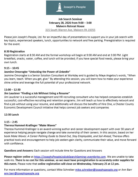 Join Joseph’s People, Ltd. and Malvern Retreat House for an impactful day focused on helping you move forward in your job search. The day includes insightful presentations, experienced speakers, lunch, networking opportunities, and free parking.